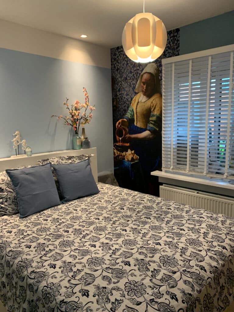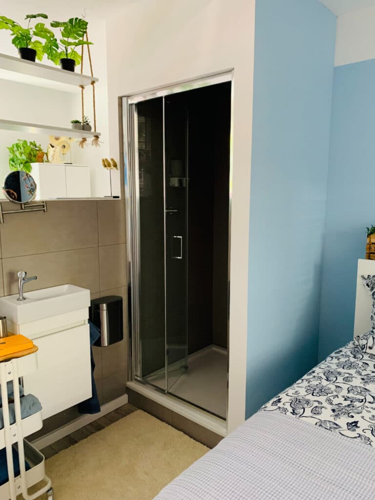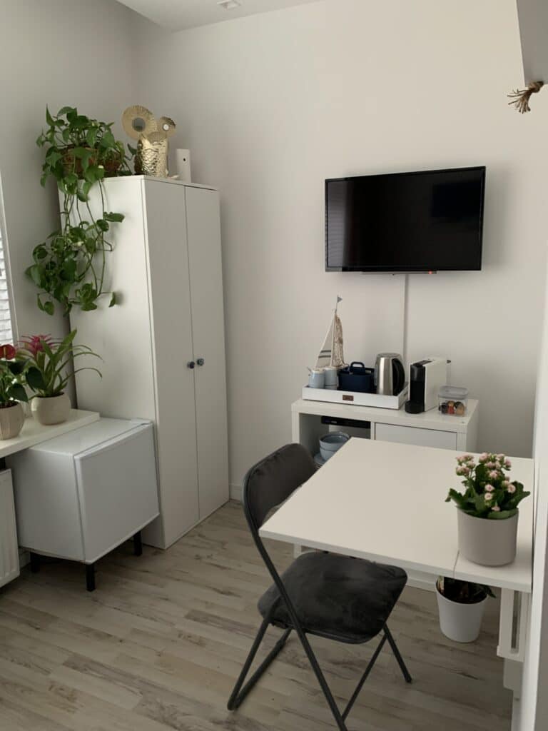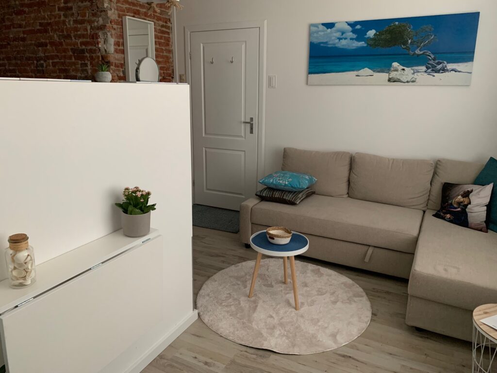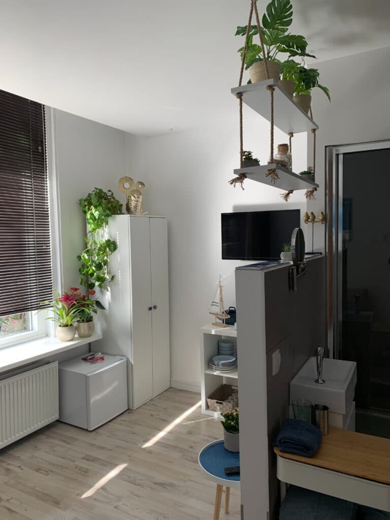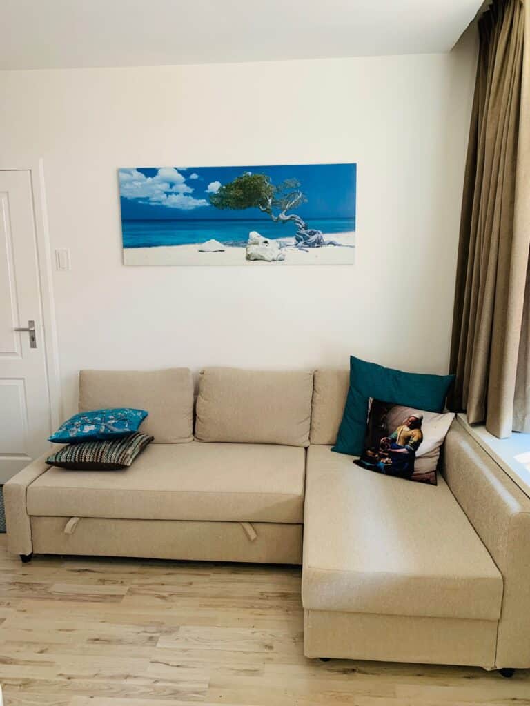 Im Erdgeschoss befindet sich Zimmer Ocean Blue. Hier haben Sie ein Schönes Doppelbett, eine eigene Dusche und Toilette. Es gibt eine gemütliche Sitzecke mit Schlasofa, das im ausgeklappten Zustand auch als Bett für 2 weitere Personen genutzt werden kann. Das Zimmer verfügt über einen Smart und Digital-TV einen Kühlschrank, eine Nespresso-Kaffeemaschine, einen Wasserkocher und einen Haartrockner.