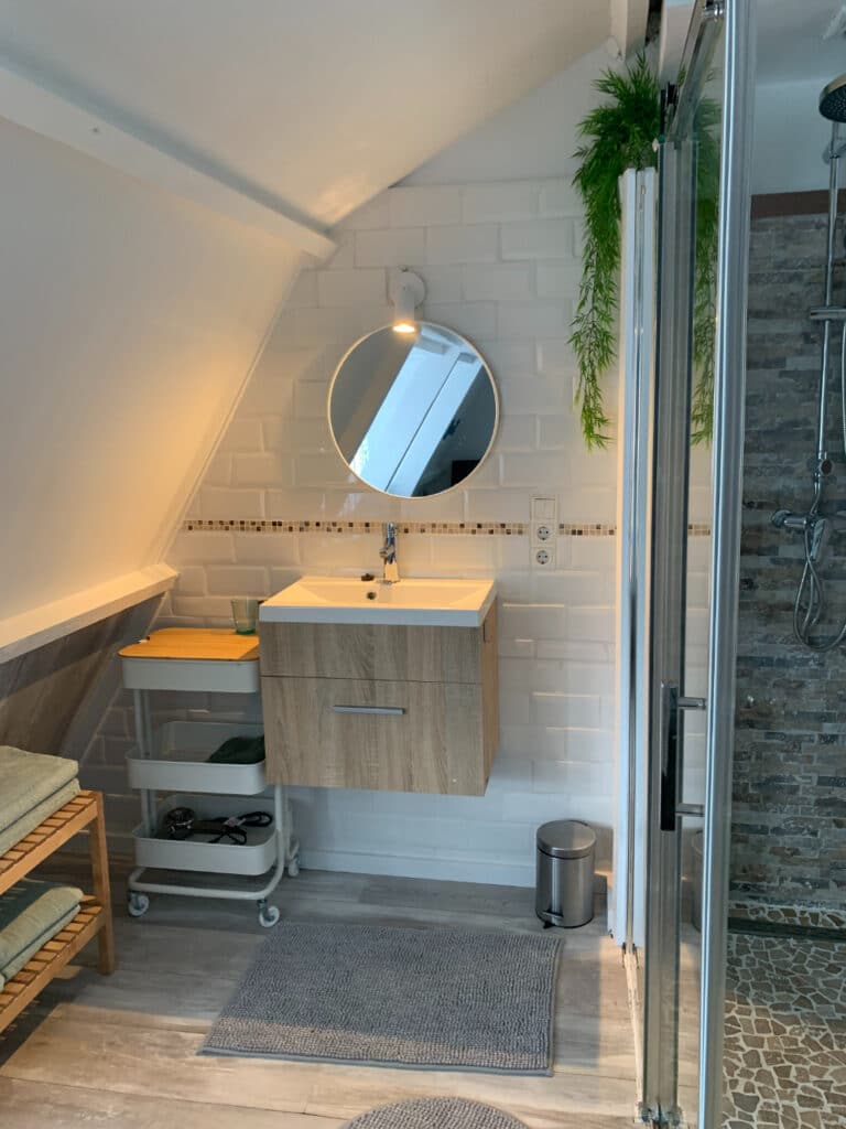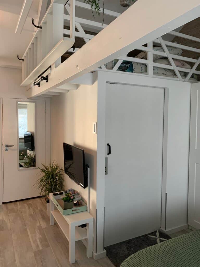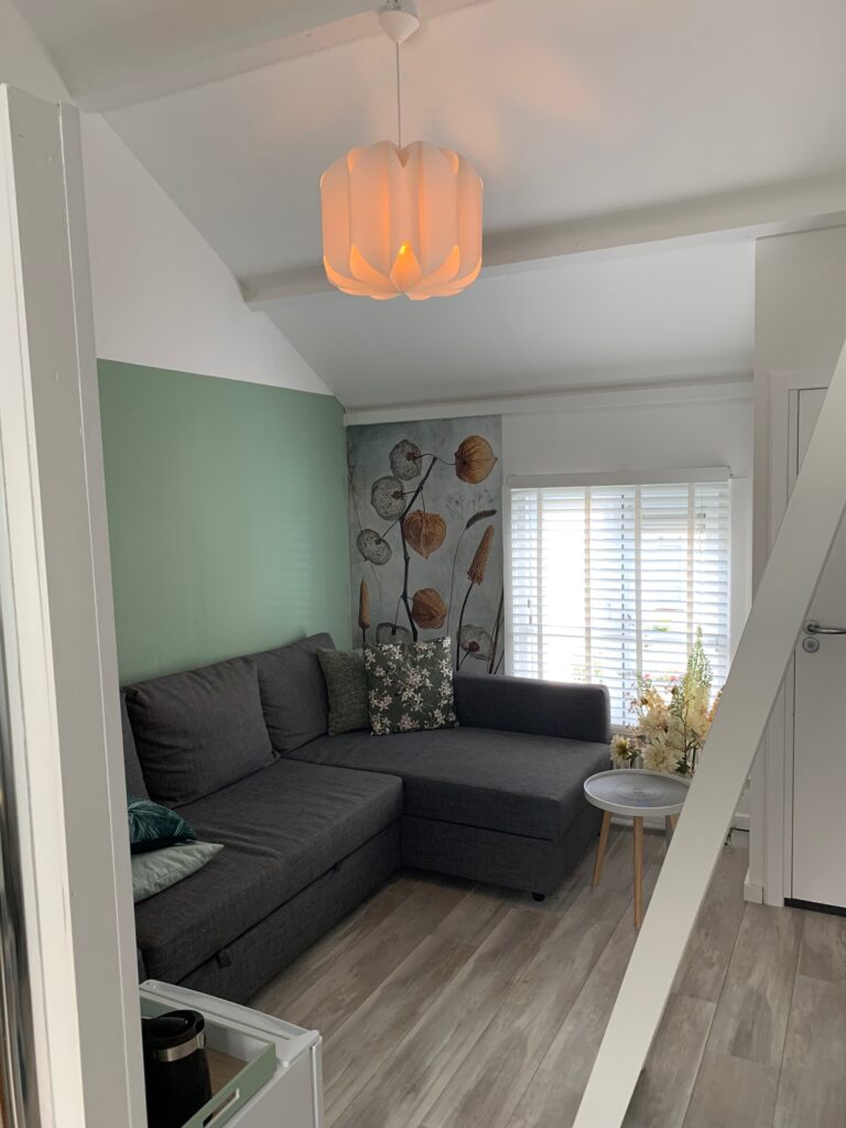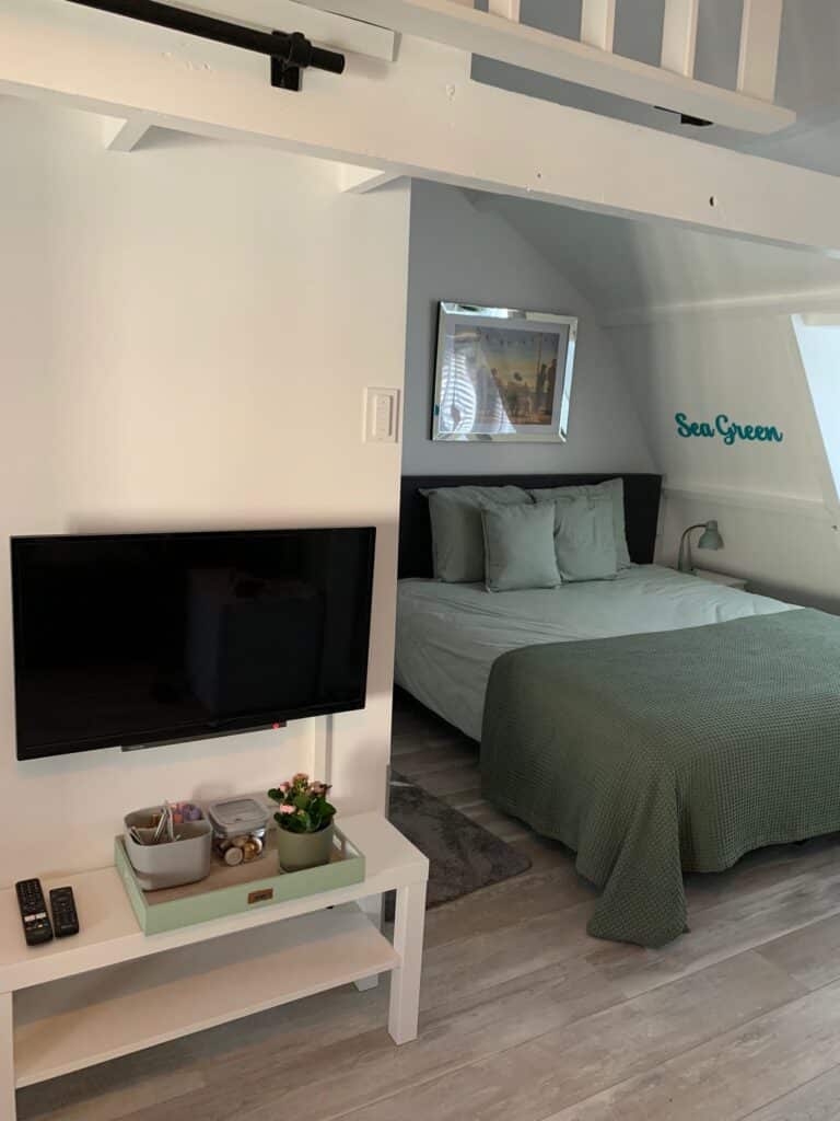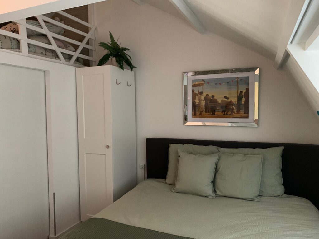 Im Obergeschoss befindet sich das Sea Green Zimmer. Sie erreichen ihn über die Treppe in der Küche. Bitte beachten Sie, dass die Treppe etwas steil und nicht sehr breit ist. Hier haben Sie Zugang zu einem geräumigen Kingsize-Bett, einer separaten Dusche und Toilette. Es gibt auch einen separaten Dachboden Für 1 Person, der über eine gemütliche Sitzecke mit Schlafsofa, das im ausgeklappten zustand auch als Bett Für 2 weitere Personen genutzt werden kann. Das Zimmer verfügt über einen Smart und Digital-TV einen Kühlschrank, eine Nespresso-Kaffeemaschine, einen Wasserkocher und einen Haartrockner.